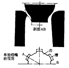 改進(jìn)方法是在接觸環(huán)處噴嘴開(kāi)始的地方加工出多條擴(kuò)散狀凹槽,分別布置在噴嘴中,由相同尺寸的常規(guī)噴嘴分隔開(kāi),如圖3所示。這樣兩股汽流在交界面處發(fā)生強(qiáng)烈混合。由于粘性耗散的影響,如果激波發(fā)生,強(qiáng)度屬于中等。這種混合極其復(fù)雜,難以計(jì)算,但誘發(fā)的擾動(dòng)消除了。