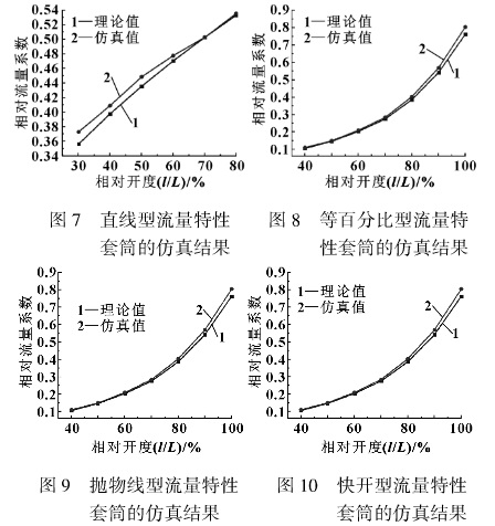 (卻△p= 0. 1 MPa)的環(huán)境中得到。小開度時(shí)因內(nèi)部結(jié)構(gòu)產(chǎn)生的較大阻力對(duì)理想流量特性的影響,為驗(yàn)證工作流量特性隨著閥門開度的變化是否滿足設(shè)計(jì)要求,檢測(cè)偏離程度的影響,采用FLUENT軟件仿真驗(yàn)證套筒窗口形狀設(shè)計(jì)。