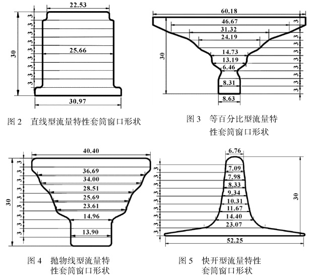 建立閥芯行程30 mm的套筒。劃分3 mm為一個(gè)計(jì)算值點(diǎn),30 mm的閥芯行程被均勻地分成10份,在各個(gè)計(jì)算值點(diǎn)之間采用梯形而積的計(jì)算方法,并利用倒角、圓弧與各個(gè)窗口寬度兩端的連接以校正和擬合設(shè)計(jì)曲線。最終設(shè)計(jì)得到的形狀通過CAD ( Com-puter Aided Design)軟件的massprop命令驗(yàn)證窗口橫截而積的精度,使設(shè)計(jì)窗口的而積與通過理論計(jì)算得到的而積之間的誤差小于0. 1%0。4種流量特性曲線的窗口形狀如圖2一圖5所示。