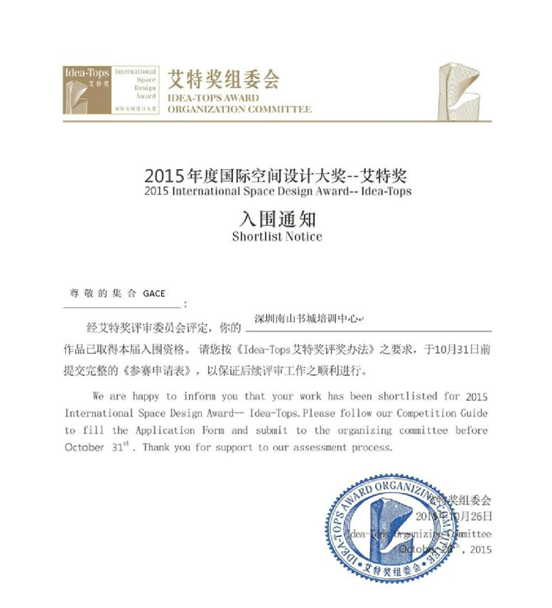 國際空間設(shè)計(jì)大獎(jiǎng)——Idopsea-T艾特獎(jiǎng),由中國建筑室內(nèi)設(shè)計(jì)行業(yè)第一門戶網(wǎng)站——中華室內(nèi)設(shè)計(jì)網(wǎng)聯(lián)合中國三大權(quán)威學(xué)術(shù)機(jī)構(gòu)——清華大學(xué)美術(shù)學(xué)院、中央美術(shù)學(xué)院、天津美術(shù)學(xué)院共同發(fā)起主辦,每年一屆,12月隆重頒獎(jiǎng),旨在打造全球最具思想性和影響力的設(shè)計(jì)大獎(jiǎng),發(fā)掘和表彰最佳設(shè)計(jì)師和最佳設(shè)計(jì)作品。深圳集合設(shè)計(jì)作品深圳南山書城培訓(xùn)中心得到大賽評委們的一致的認(rèn)可,獲得最佳文化空間設(shè)計(jì)入圍獎(jiǎng)。與諸多國際設(shè)計(jì)師同行同臺(tái)競技,交流設(shè)計(jì)理念。也是集合設(shè)計(jì)公司一直熱衷和堅(jiān)持在做的事情。