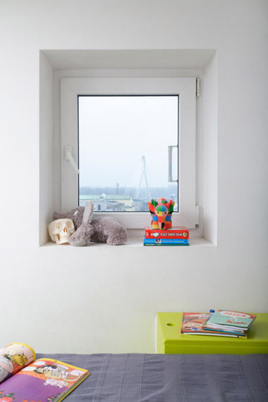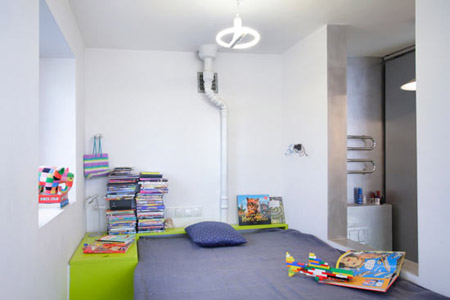 除了迎合兒童口味的亮麗色調(diào)外,室內(nèi)還可以看到多處節(jié)省空間的精巧設(shè)計,如可以閉合的廚房&餐廳、位于門廳的浴室、便于儲物的墊高的床等,以滿足兒童對視野和活動空間的需求。
