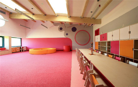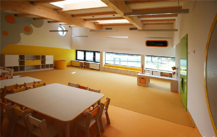 Yellow Elephant幼兒園位于波蘭Ostrow Mazowiecka,單層天井式的建筑結構,屋頂采用膠合木板打造,共有5間,可招收125名兒童。內部的庭院打造沙坑、樹木及草地等,這里也是幼兒園的中心區域。面向庭院的立面安裝大型落地玻璃窗,內部既可以獲得充足的光線,也能欣賞到庭院的景色。幼兒園設計