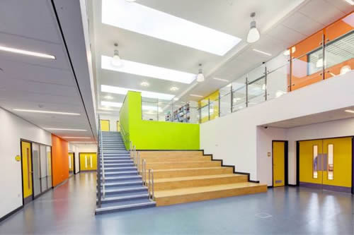 客戶希望擁有一所環境可持續發展的學校,并可以獲得相關的生命周期效益,這些要求被納入了設計開發中。建筑幾乎完全自然通風,面對一條繁忙道路的立面能夠降低噪音。中央北向窗戶與建筑管理系統相連,建筑管理系統會對建筑內的溫度和二氧化碳含量做出反應。所有的教室和學校大廳都有通風煙囪,可以通過立面的洞口和格柵進行被動通風。建筑過熱的潛在問題通過仔細設計懸挑結構和建筑朝向得到了解決,無需使用機械通風和制冷設施。環境性能取決于細考慮的建筑方案,并通過能對日光、熱和二氧化碳含量做出反應的“智能”機電系統得到提高。