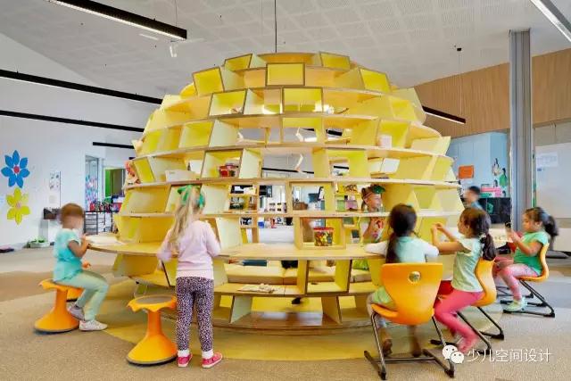 “蜂巢”還提供機(jī)會(huì)或交談空間。里面的座位為孩子們提供了“隱蔽的空間”,可以用來(lái)進(jìn)行討論、玩游戲,或者只是在這里做功課。在“蜂巢”頂部開(kāi)口有個(gè)圓形熒光燈,照明極佳。不同顏色的地毯也為“蜂巢”劃定“特殊”區(qū)域。