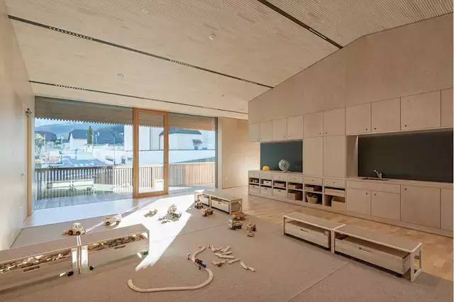 在小鎮的教堂附近,有一座新建的占地950㎡的幼兒園,幼兒園有一個大大的露天庭院,院里種植這草皮,還設計有一小塊沙地,孩子們可以在這小沙池中玩耍,靠近庭院的一面墻體的設計也是非常有意思,里面是安裝了木梯的攀巖墻,還有一部滑梯,所以即便是雨天,孩子們也可以在這個小天地里愉快的玩耍。幼兒園的設計也遵循著小鎮的風格漆白的墻面外部用木材裝飾和周圍的小鎮建筑以及自然景物,和諧相融。