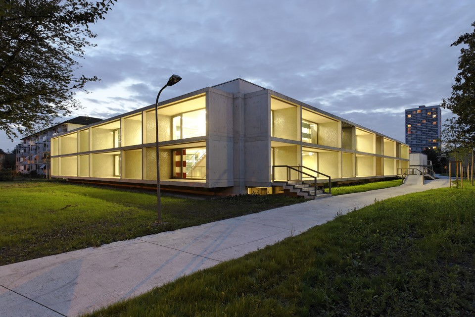 位于瑞士蘇黎世Hirzenbach區域的城市結構如同花環般層次分明,外圍的公寓樓高低起伏,環繞著中間開闊、平坦而低矮的學校建筑。而由Basler & Hofmann事務所所新建的建筑意在加強現有城市肌理的邏輯關系,在學校的北面建起了一座僅僅有一層高的幼兒園,而南邊的半下沉體育館則充分考慮了其作為開放性公共空間的通透性。