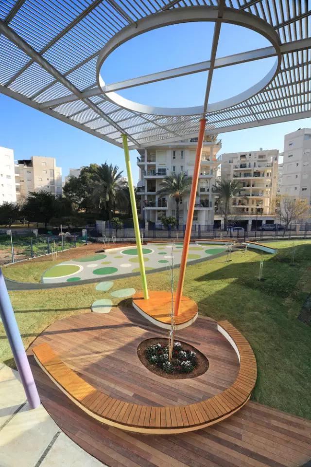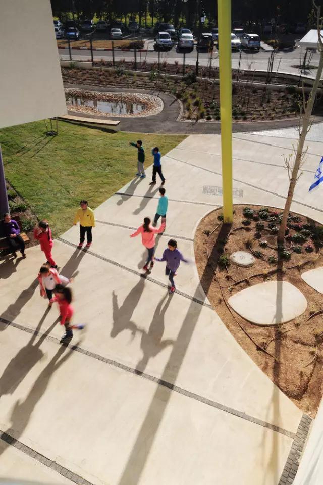 在KRakafot小學(xué)操場(chǎng)設(shè)計(jì)中,“冬日池塘”只是一個(gè)綜合綠色建筑的例子。小學(xué)有18間教室,是以色列環(huán)境部的一個(gè)試點(diǎn)項(xiàng)目,為了未來(lái)建設(shè)更多類(lèi)似的生態(tài)型學(xué)校。這類(lèi)學(xué)校的額外附加價(jià)值是多方面的,包括環(huán)境意識(shí)、環(huán)境保護(hù)、資源的有效利用、最佳學(xué)習(xí)條件和環(huán)境教育。學(xué)校主路和停車(chē)場(chǎng)用可回收石磚鋪成,形成主要的空間,路兩邊坐落著獨(dú)立的學(xué)校建筑:教學(xué)樓、圖書(shū)館、行政樓和體育館。主路連接學(xué)校的不同區(qū)域。沿著主路,一路種植了楊樹(shù),它們很快會(huì)長(zhǎng)高,進(jìn)入藤架的開(kāi)口,在道路上方提供綠蔭。