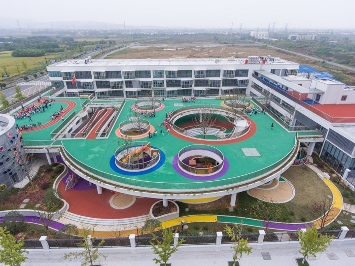 在浙江湖州長興縣龍山街道的中心幼兒園,在十月十七日正式開園,這是一個投資八千萬元占地十九畝的幼兒園,據了解這個幼兒園的設計理念是來源于日本,在日本富士有個幼兒園和空山中心幼兒園一樣都是在郊外建設的,因為土地有限但是學生們還是需要一個可以給學生運動的的操場,為了解決這個場地不足的問題所以設計師還講操場跑到設計到了屋頂,做成了一個環形結構,之所以要這樣設計是因為孩子的運動規律是特別喜歡跑圈。