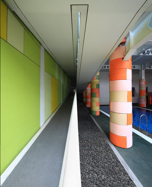 這個建筑的設計處處為孩子們的安全著想。園長的辦公室專門設置在一樓,臨近操場和游泳池,這樣可以方便園長監控孩子們活動時的安全。操場的地面采用了1.5厘米厚的橡膠材質做地板,游泳池被欄桿圍了起來,以防止孩子們發生安全事故。(幼兒園室內設計