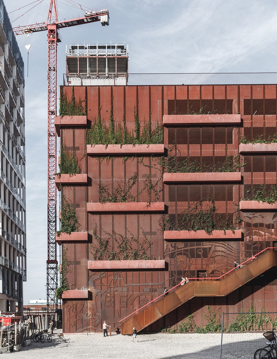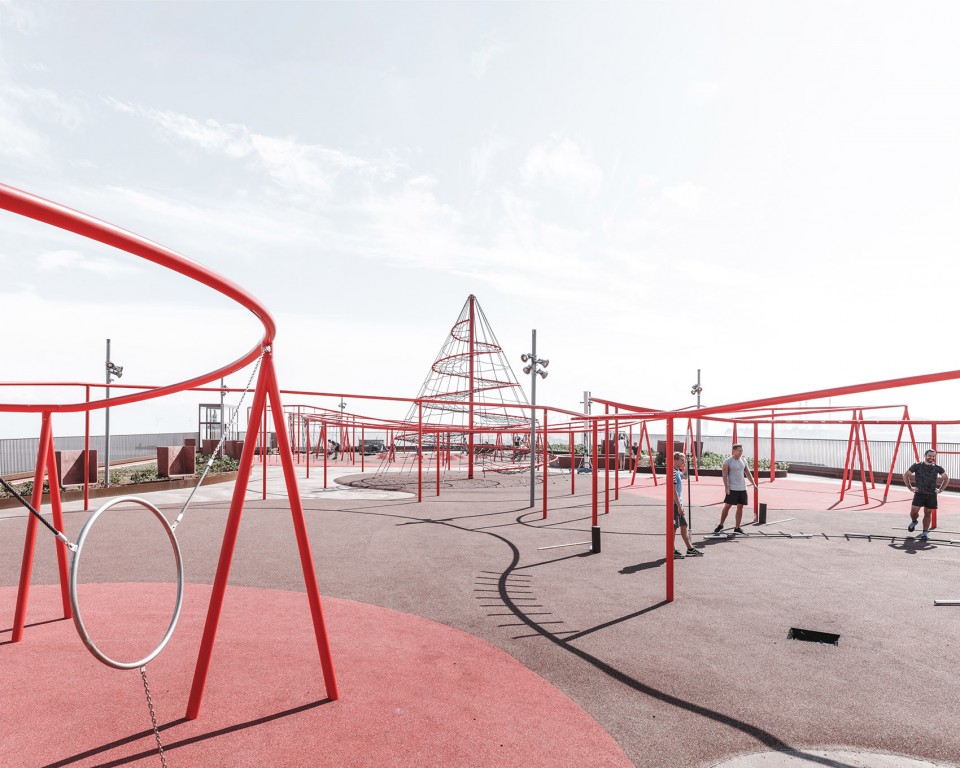 設計師沒有遮掩而是希望以暴力的結構打破立面,樓層的外部掛著一系列的種植槽,和建筑的結構相呼應,在給人們創造適宜的空間的同時也把綠色帶到了每個角落,兩條巨型樓梯穿插其中,樓梯之上采用鋼制扶手防護延綿而上,而轉到屋頂之后則是轉化為秋千、攀爬架、單杠等等面向各個年齡階層的運動游樂設施,創造出一個活力十足的公共空間。