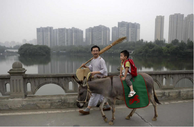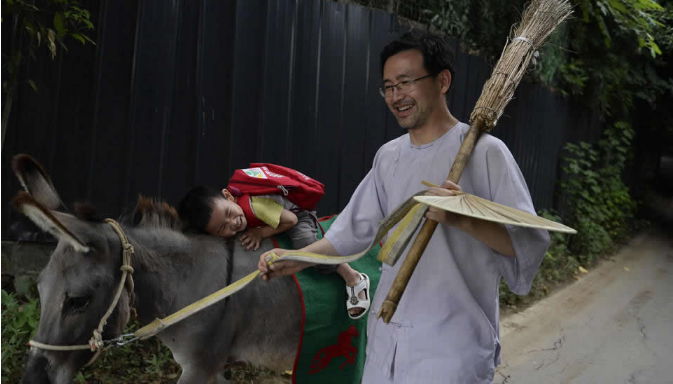 李里牽驢到幼兒園門口接孩子,路上教孩子背《三字經》、《劍門道中遇微雨》