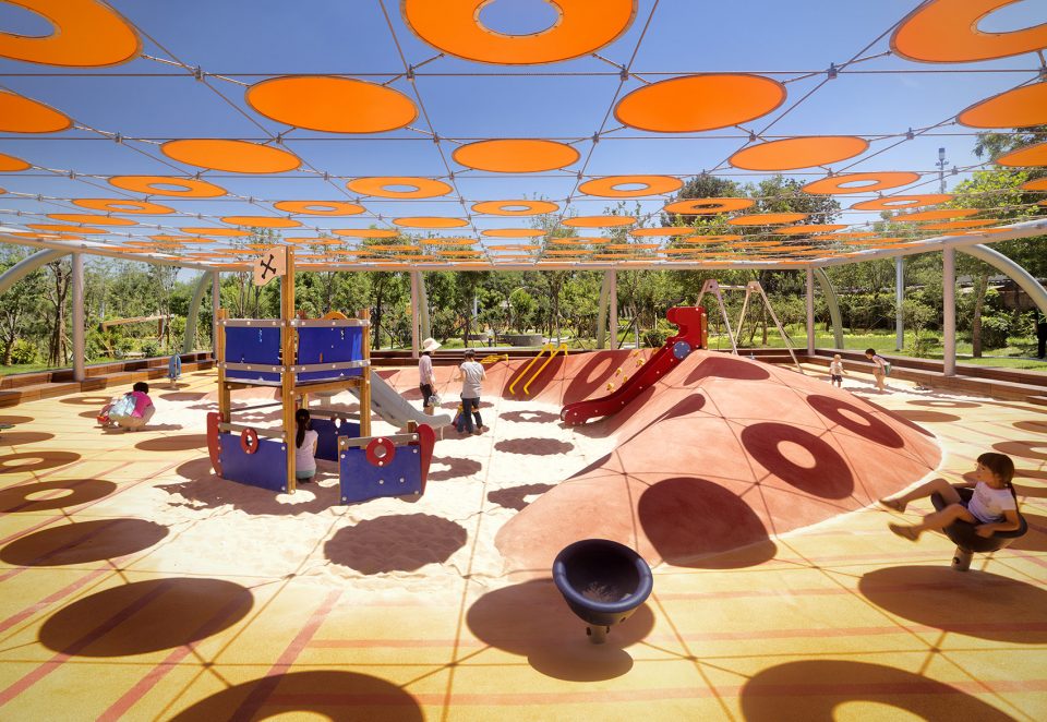 第一個(gè)游樂場(chǎng)是一個(gè)與景觀完美相融合的正方形區(qū)域。這個(gè)場(chǎng)地由木制長(zhǎng)椅圍合成一個(gè)微微下沉的地塊空間。這種為家長(zhǎng)提供的休憩空間也劃定了場(chǎng)地的界限,為孩子們創(chuàng)造了一個(gè)安全的游戲區(qū),讓他們可以盡情地玩耍。為了進(jìn)一步增強(qiáng)圍合感和保護(hù)感,橙色圓盤構(gòu)成的天蓬懸浮在人們的頭頂上。這些圓盤在柔軟的游樂面上投射了一層棋盤狀的陰影,為孩子們遮擋陽光,驅(qū)逐炎熱。