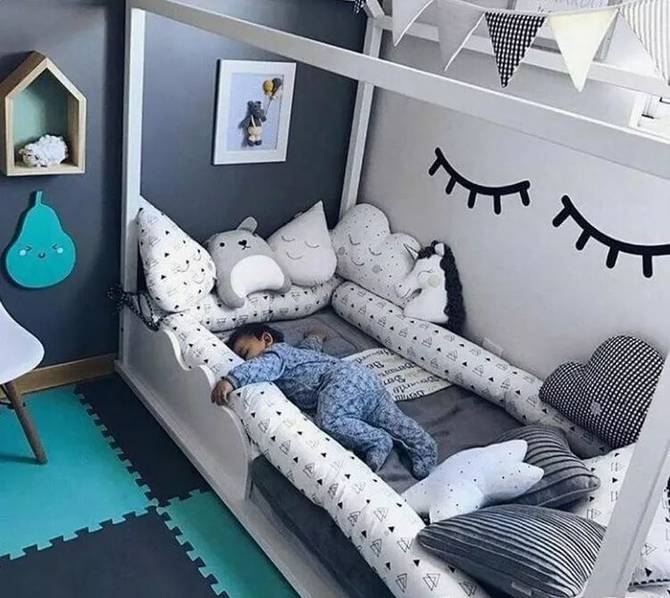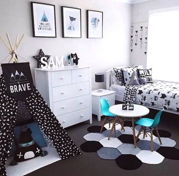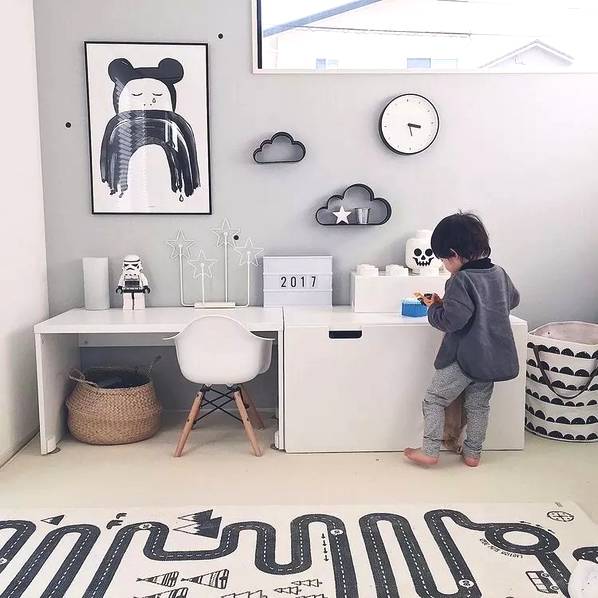 房間里還可以設置一些簡易的玩樂設施。1-3歲的孩子需要父母的時刻陪伴,我們可以在房間或者客廳放上爬行墊+安全圍欄給孩子一個小區域領地,把這里變成一個親子小游戲區。在兒童房里也可以在地面貼上玩具貼紙,把局部地面變成孩子的游戲地圖,適合在游戲中培養孩子創造力和分享的意識,留出空間,讓孩子可以和朋友或者和父母一起玩玩具,孩子1歲之后我們可以適當添置一些矮柜來收納玩具,還可以讓孩子扶著學走路。在兒童床上加一個木架結構,把床做成木房子,給孩子一個開放的獨立空間。這種具象的區域不僅會給孩子安全感,還能滿足他們的探險欲,