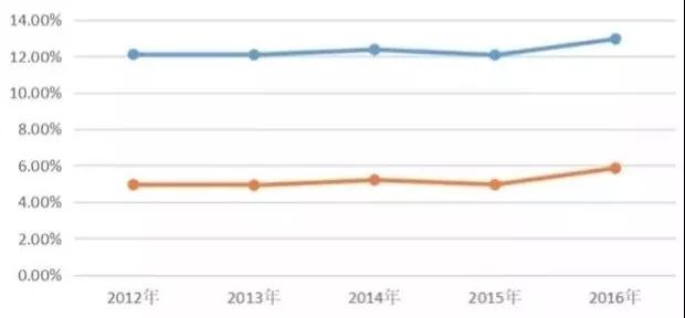 上述圖表是2012年-2016年中國人口出生率和自然增長率概況。出生率在2014年曾出現小幅上漲達到12.37‰,2016年漲幅較大達到12.95‰,其余時間無明顯變化,均維持在約為12‰的水平。