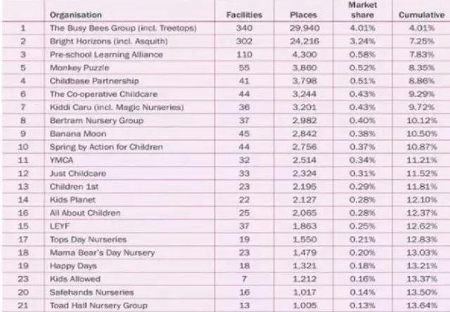 再來講一講,英國早教市場的育化。下圖是2018年英國早教市場前21名:(英國義務教育從4歲開始,0-4歲的保育階段已經高度市場化)