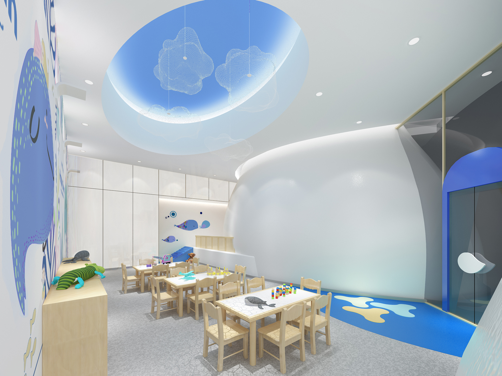 1、在對早教中心進行裝修的時候,比較明亮、溫暖,頂面燈光配給,要考慮到兒童的接受光照度來計算。