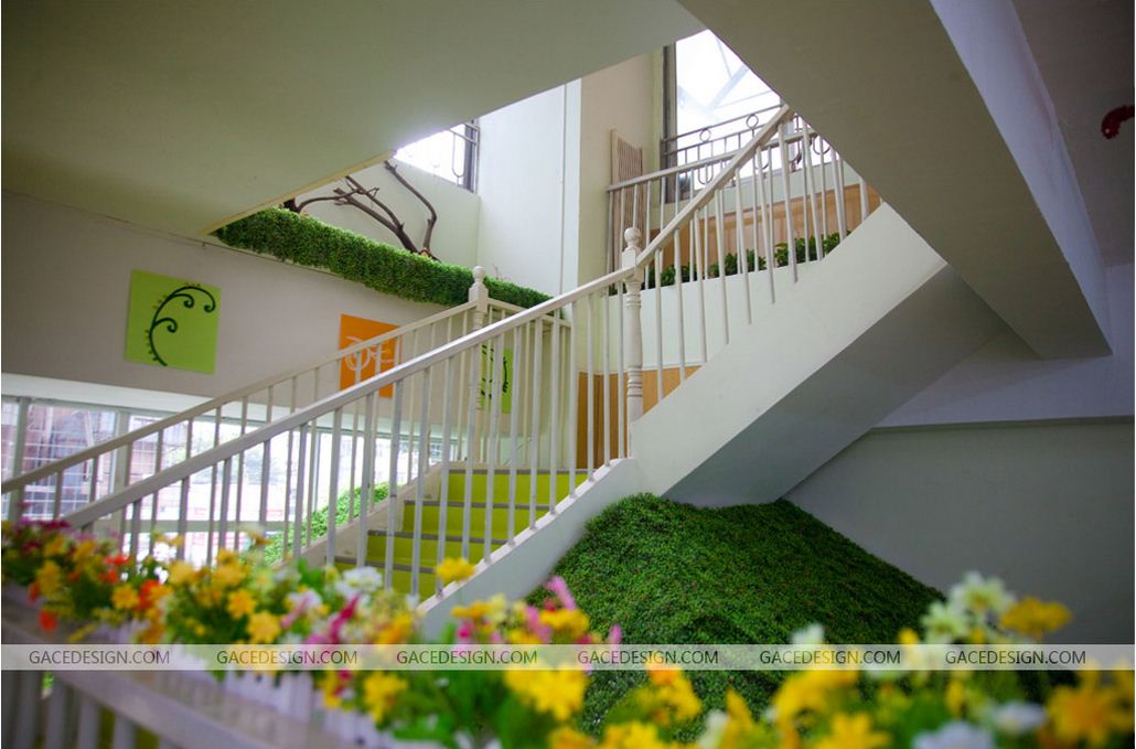利用裝修,克服原有建筑的事故隱患,保障幼兒安全,是幼兒園裝修中特別要注意的一點。樓梯方面,幼兒翻越樓梯扶手或把扶手當成滑梯玩時,都有可能發生傷害事故。為避免事故發生,幼兒園一般采用掛網處理,手段比較單一,也欠美觀。在樓梯所形成的空間底部,用質地較軟的杉木裝修成波波球池,樓梯的水泥側面也用杉木板包邊。萬一幼兒翻越欄桿,身體碰撞在軟處理過的欄桿上,可無大礙,掉在波波球池里,也是軟著落,有驚無險。