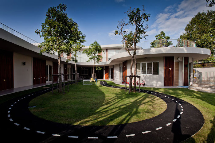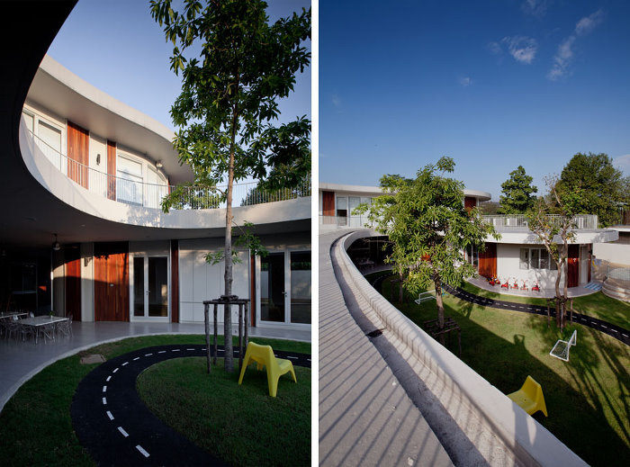 有一所有趣的幼兒園,這個院子里有著耀眼白色跑道的肯辛頓國際幼兒園位于泰國曼谷,在2012年的時候完工。項目主旨在于激勵孩子們用自己的空間想象感知找到玩樂的趣空間。