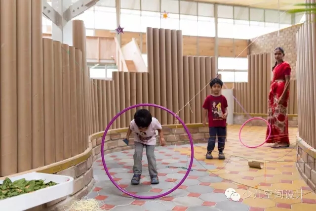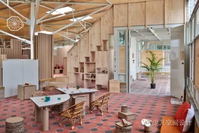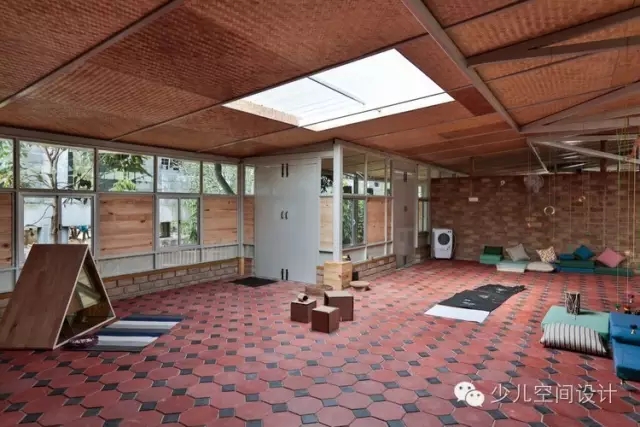 建筑包含4間教室,中心廣場邊上的一間工作室和一間幼兒啟蒙中心的房間與廣場之間有著過度的濾光板。衛(wèi)生間的設計考慮到了低領人群,小型的尺度不僅適合孩子,還方便監(jiān)護。衛(wèi)生間暴露的排水管與小便墻的設置能夠被孩子舒適地使用,并易于維護。