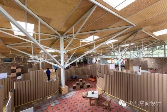 通過滲透性的室內設計,鼓勵了孩子們的探索學習——不同高度的墻體圍合了懸挑的教室和公共空間,其上是穿孔的天窗。屋頂收到8根柱子的支撐,每一個形式都是樹枝分叉。這個樹的形式,在形成結構元素的同時,讓屋頂?shù)母叨饶軌蚋鼮楹⒆觽兯兄??!皹洹毕碌目臻g同時重新詮釋了學習的區(qū)域,這樣的場景在郊外隨處可見。