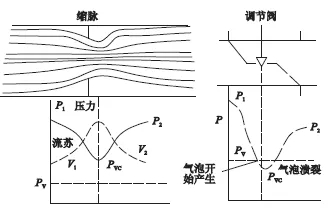 圖4 閥內(nèi)流體速度-壓力變化及汽蝕形成原理