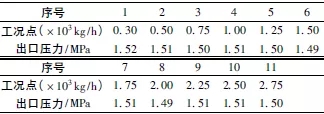 在某專用減溫減壓裝置裝備配套中,采用高壓差給水調(diào)節(jié)閥,進(jìn)口壓力P1=8.6MPa,出口壓力P2=1.5MPa,減溫水溫度tb=104℃,減溫水流量Q=2.5t/h,選用高壓差調(diào)節(jié)閥的規(guī)格為DN20、PN100。樣機(jī)試驗(yàn)時(shí),取工況點(diǎn)共11個(gè),對(duì)各個(gè)工況點(diǎn)進(jìn)行性能試驗(yàn)及整體破壞性試驗(yàn)(表3),均達(dá)到技術(shù)要求。